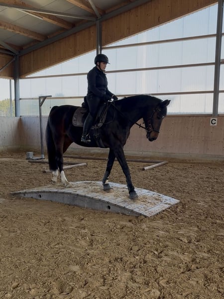 Beautiful 10-year-old Diacontinus daughter! 16.0 hh Daphne is well-behaved and well-mannered both on the ground and under saddle. She is currently ridden regularly in the arena and in the field. She is familiar with lunging on double longe, dressage work, working equitation, and jumps small courses. However, she is not suitable for complete beginners or nervous riders. She does not buck or rear! Daphne is very light in the mouth and masters all kinds of lateral movements. Flying changes have been introduced. Due to health findings that do not affect her performance, she is being offered at a significantly reduced price. Video available. Please contact via WhatsApp directly at 017651788446.