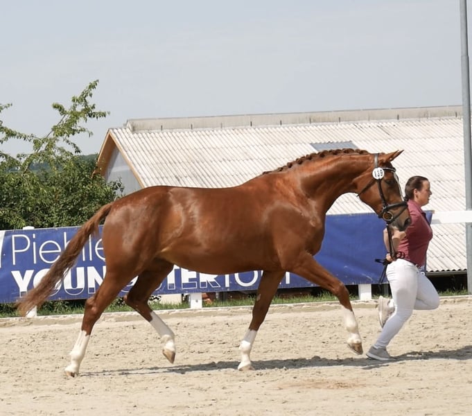 Nach ihrer Leistungsprüfung (2019 in Neustadt Dosse) wurde Bella nicht weiter unter dem Sattel gearbeitet, da sie bei uns ursprünglich als vierjährige Stute in die Zucht gehen sollte. Es hat jedoch zwei Jahre gedauert, bis wir sie erstmals tragend bekommen haben. In den Jahren 2023, 2024 und 2025 hat sie anschließend jeweils ein Fohlen zur Welt gebracht. In dieser Zeit war sie mit ihren Fohlen auch auf verschiedenen Fohlenschauen und Championaten.Dort zeigte sie sich stets völlig unkompliziert, souverän und sehr behutsam im Umgang mit ihrem Nachwuchs, was ihr tolles Interieur eindrucksvoll unterstreicht. Aufgrund der anfänglichen Bedeckungsschwierigkeiten möchten wir Bella nicht als reine Zuchtstute anbieten – auch wenn eine weitere Zuchtnutzung grundsätzlich nicht ausgeschlossen ist. Erst im November dieses Jahres wurde sie wieder behutsam angeschoben und zeigt sich sehr kooperativ, motiviert und leichtrittig. Aktuell befindet sie sich auf einem soliden A/LNiveau und bietet ein angenehmes Reitgefühl mit drei guten Grundgangarten, wobei ihr besonders klarer, taktsicherer und sehr guter Schritt hervorzuheben ist. Im täglichen Umgang präsentiert sich Bella äußerst zuverlässig und freundlich. Sie zeigt sich beim Putzen,Longieren und auch im Gelände stets brav und unkompliziert. Zudem ist sie sowohl schmiede- als auch verladefromm und verhält sich in jeder Herde sozial und ausgeglichen. Darüber hinaus ist sie sehr leichtfuttrig. Bella eignet sich ideal für Reiter, die eine umgängliche, rittige und charakterstarke Partnerin suchen und Freude daran haben, eine frisch wieder in Arbeit befindliche Stute weiter zu fördern.