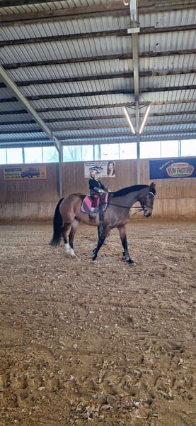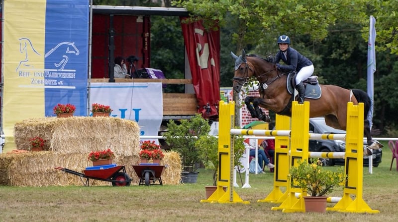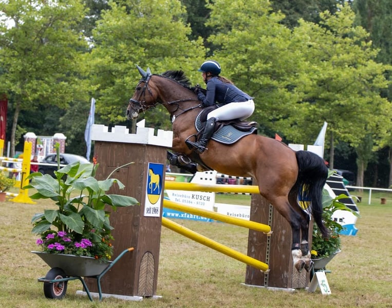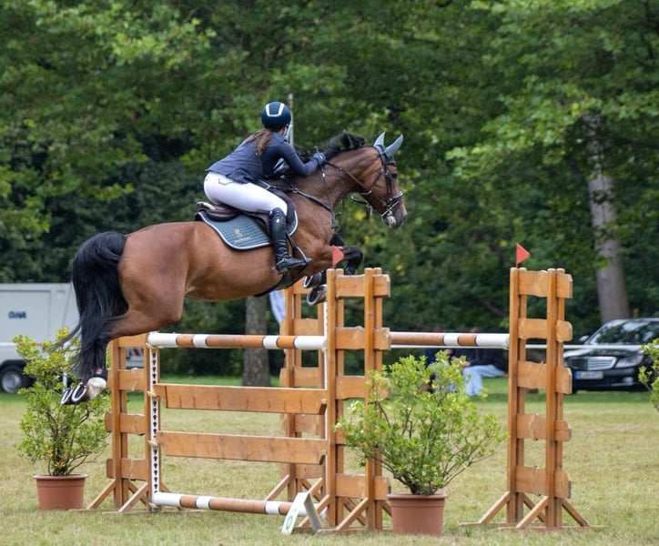 For sale: German sport horse – elegant mare, born in 2013, brown, height 16.1 hh Our mare Carla, bred from our own stock, has competed up to S* show jumping and has placements up to M** level. She is very well-behaved in handling and would also be suitable for children or ambitious young riders. She is easy to ride in the terrain, both in a group and alone. Carla has already foaled a healthy foal. Due to lack of time, she is offered into good and caring hands. Please feel free to contact me via WhatsApp for more information. Videos available upon request.