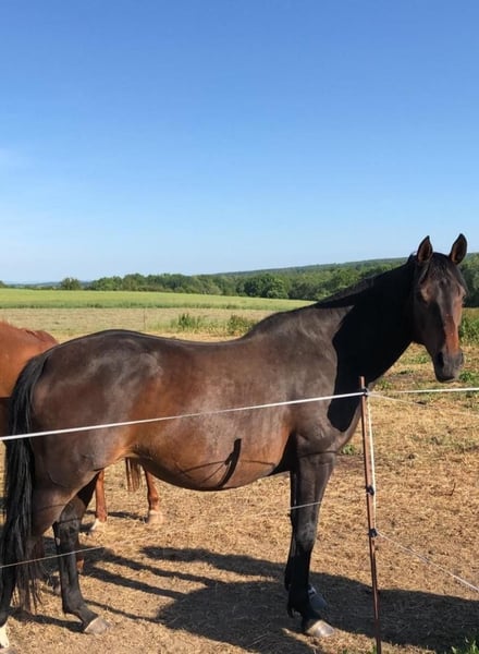Beautiful Warmblood Mare Due to discontinuation of horsekeeping and lack of time, I am offering her for sale. Born in 2012 (own breeding), approximately 1.60 m tall, dark bay, with equine passport. Mother: German Riding Horse (Deutsches Reitpferd) Father: Thoroughbred Used recreationally (riding school), needs retraining for light sport use. Over the winter, she was regularly ridden by my daughter in riding lessons (dressage and jumping lessons). During summer, she is turned out on the pasture due to lack of time (ridden sporadically here). Owned by me for 14 years, from my own breeding. With daily handling, she has a pleasant temperament. Not suitable as a beginner’s horse in a new environment, but in familiar surroundings, she can be ridden comfortably even by less experienced riders. I bred this mare for eventing and breeding purposes. She has completed her mare performance test. I also bred a foal with her (awarded premium). The mare is healthy, shoeing and loading are no problem. Besides leisure riding and light sport, her Thoroughbred blood makes her well-suited for breeding. For further information and to arrange a viewing, please feel free to contact me.