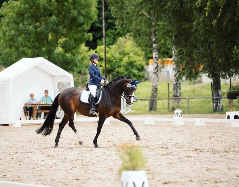For sale is a stunning, well-trained dressage mare that impresses with her elegant appearance and exceptional talent in the dressage arena. Born in 2002, she combines extensive experience with top-level performance readiness. She has achieved success from dressage horse class A to M, with scores up to 8.2! She is a reliable partner for the ambitious rider who values a well-ridden, sensitive dressage partner. Thanks to her clear-headedness, she is also suitable for young or novice riders. Her consistency in lessons makes her an excellent schoolmaster. With her dark coat color and excellent conformation, she is not only a visual highlight but also impresses with her movement quality and pleasant temperament. She is versatile in training, possesses a solid basic education, and consistently shows motivation and cooperation during training sessions. Thanks to her excellent pedigree and natural talent, she is ideal for both competitive dressage and leisure riding. This dependable mare is ready to accompany her next rider at competitions and in training. She is also a true sweetheart in handling and always eager to please. If you are looking for a wonderful horse that makes daily work enjoyable, please feel free to contact us to discuss further details and arrange a viewing. Of course, she is farrier- and loading-trainable. Later, she could also be very interesting as a broodmare!