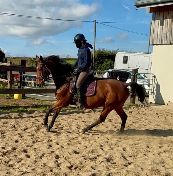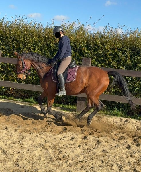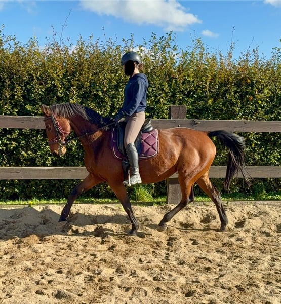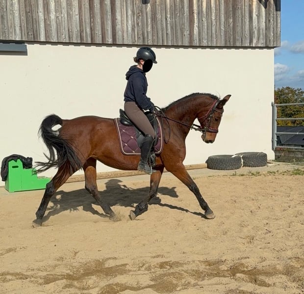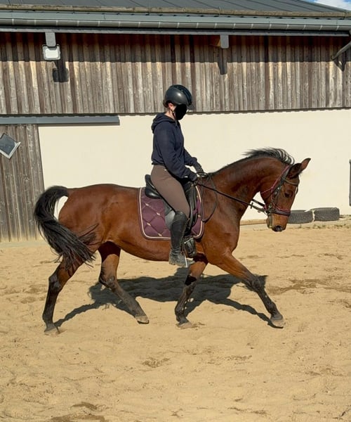 For sale is a German sport horse, a 17-year-old mare approximately 16.1 hh with full pedigree on her passport (Amantus x Korsine). She is in excellent condition and is currently being ridden regularly. She is easy to handle and shows a very calm and obedient demeanor during work. She moves softly into contact and has previously competed in sport. In handling, she is absolutely well-behaved and always manageable without issues. She is not spooky and remains relatively relaxed. No known illnesses or allergies. An ultrasound examination (AKU) can be performed upon request. A trial ride, pre-ride, or other testing of the horse costs €35. This amount will be credited towards the purchase if you decide to buy. Please call or send a message to 0157 36803742. All information is provided without guarantee. Prices are subject to change. Transport can be arranged, and online purchasing is possible.