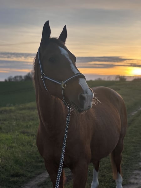 Hallo zusammen, schweren Herzens müssen wir uns leider von unserer Stute trennen. Sie ist ein Deutsches Sportpferd mit einem Stockmaß von ca. 1,65 Sie ist 2007 geboren. Was gibt es über sie zu erzählen? Sie ist eine absolut coole Socke und für jeden Spaß zu haben. Sie ist Verladefromm, Schmiedefromm und egal was man vor hat, sie fragt nicht lange nach und ist mit dabei. Sie geht für einen durch dick und dünn und ist hierbei auch von jedermann handelbar. Ob Kinder, Hunde oder Traktor sie bringt nichts aus der Ruhe. Als Freizeitpferd einsetzbar. Für Ausritte ist sie immer zu haben und ist hier auch nicht vom alten Eisen. In der Halle/auf dem Platz sollte auch mal die Bodenarbeit im Vordergrund stehen. Hier zeigt sie sich überaus motiviert und arbeitet mit. Sie kann auch noch geritten werden nur sollte man ihr nicht mehr zu viel zumuten und sie eher für Kinder oder zum Freizeitreiten einsetzen. Ohne Turnier und tägliches Training. Vorne trägt Sie Hufeisen. Für Kinder ist Sie ein absolutes Lehrpferd und man kann sich immer auf Sie 10000% verlassen. Beim Putzen steht Sie ruhig und kuscheln macht Sie auch gerne. Vielleicht gibt es eine Familie mit Kindern. Die einfach ein Lehrpferd haben möchten ohne das dass Pferd als Sportgerät im Vordergrund steht. Spazieren gehen liebt Sie…. Für Fragen einfach bitte melden. Weitere Fotos gerne anfragen.