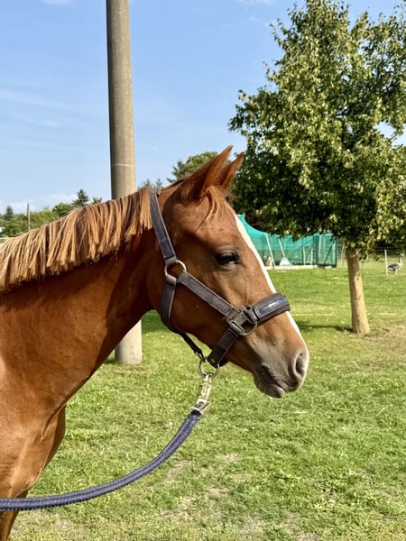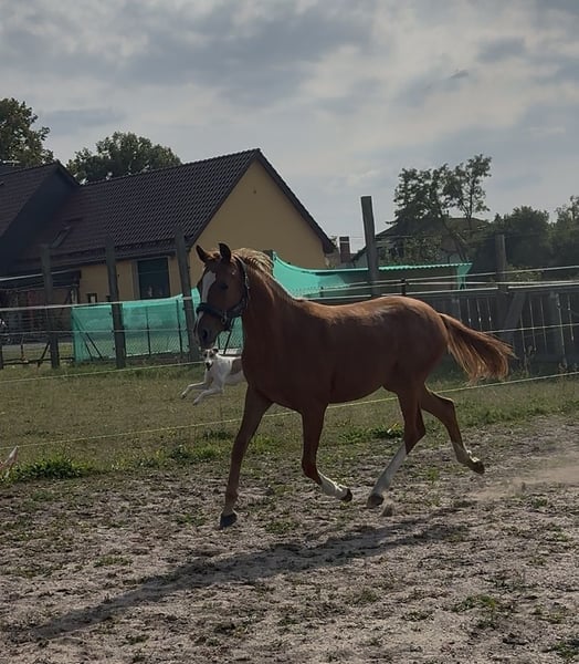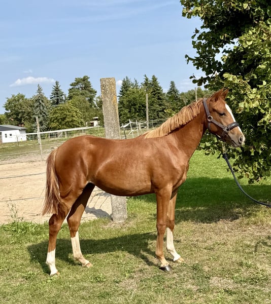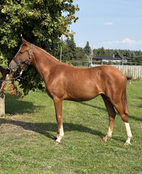 Zum Verkauf steht unsere Jährlingsstute von dem Westfalen- und Bundeschampion Herzgold D (palomino) aus einer Naron-Mutter (Palomino-Gen). Wie ihre Mutter besticht Cleo (Cover me in Sunshine PRZ) durch ihr freundliches und menschenbezogenes Wesen. Das Herz von Mutter und Halbbruder schlägt fürs Springen, wo sie auch ohne Ponybonus oft siegreich an Turnieren teilnehmen. Ihr Halbbruder ist dieses Jahr nach Österreich verkauft wurden und begeistert dort als springambitioniertes Kindersportpony mit seinem Talent und großen Herzen. Auf dem letzten Bild sieht man ihn in Moritzburg 4-jährig. Meine 19 jährige Tochter hat ihn problemlos selbst ausgebildet. Von dem mehrfach preisgekrönten Dressurvererber Herzgold D hat diese einzigartige Jährlingsstute ihre edle und grazile Erscheinung und wird zwischen 1,45 m und 1,48 m groß werden. Durch diese Verpaarung wird sie sowohl im Springparcour wie im Dressurviereck dem jungen Reiter viel Freude und Spaß bereiten. Sie kennt das Fohlen ABC und ist auch beim Schmied und Hängerfahren ganz brav. Bei näherem Interesse kontaktieren Sie mich gern.