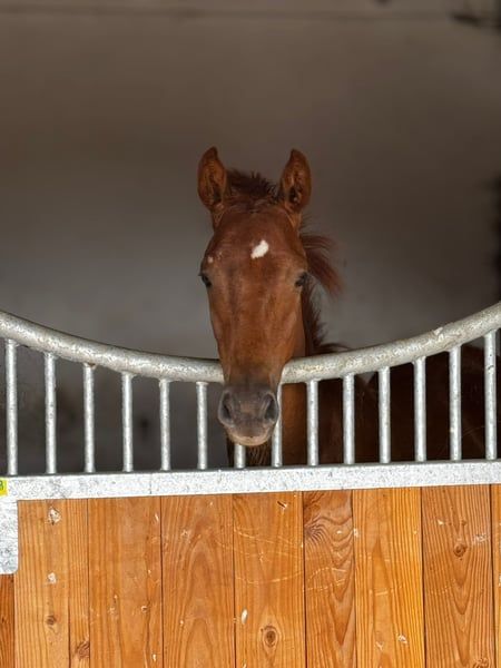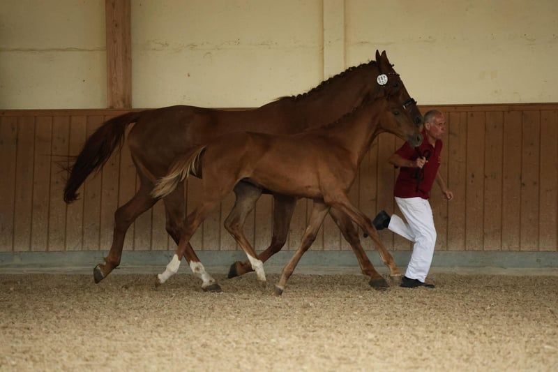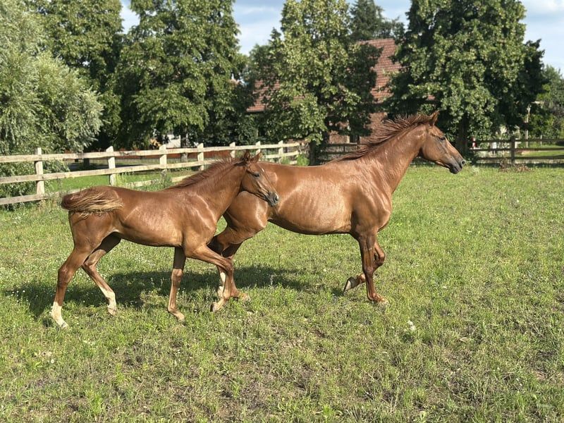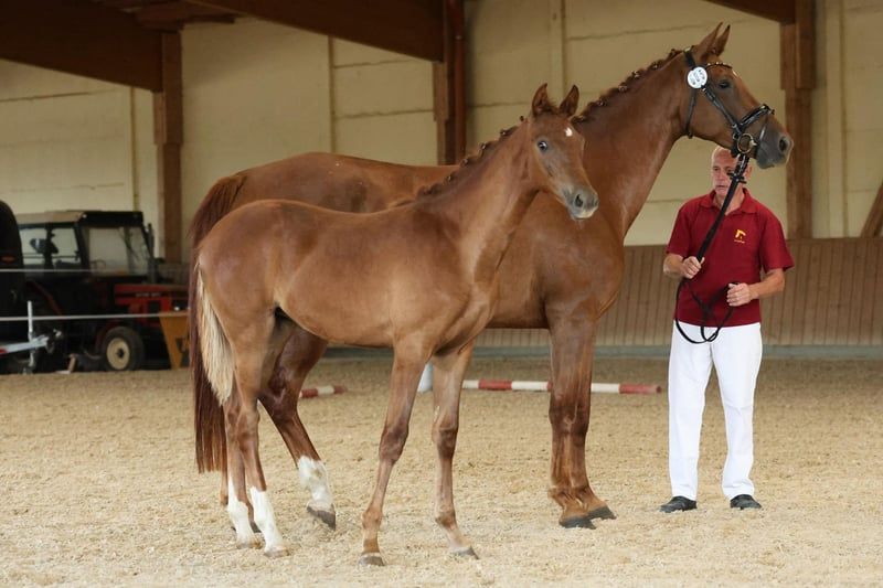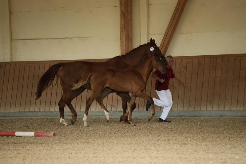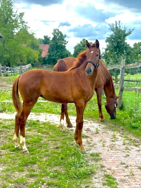 For Sale: German Sport Horse This stunning chestnut mare, Quina from Marienhof, is a talented and correctly built German sport horse with great potential for dressage and an impressive pedigree. She is suitable for ambitious dressage riders as well as for sport-oriented leisure riders who value quality, character, and future prospects. ⸻ Pedigree Details Her sire, Quaterback (DSP), is one of the most influential dressage sires of his generation. His offspring impress internationally with rideability, presence, and successes up to Grand Prix level. The dam line also boasts proven performance potential, with notable ancestors such as Don Royal, Don Juan de Hus, Rubin-Royal, Jazz, and Rubinstein I, representing modern dressage lineage and reliable willingness to perform. ⸻ Movement & Conformation Quina was awarded an 8.0 at her foal inspection for type, conformation, and movement—a clear indication of her solid quality. She demonstrates rhythmic, elastic basic gaits in free movement, with an active hind leg and elegant uphill carriage. Her harmonious build, expressive appearance, and long lines make her a true eye-catcher with great potential. ⸻ Temperament & Daily Handling Quina impresses with her balanced, friendly nature. She is human-oriented, clear-minded, and shows herself to be open, attentive, and eager to learn in daily handling. For further information or if you are interested, please feel free to contact me. Visits can be arranged by appointment. We look forward to your inquiry!