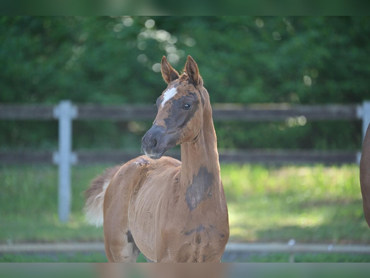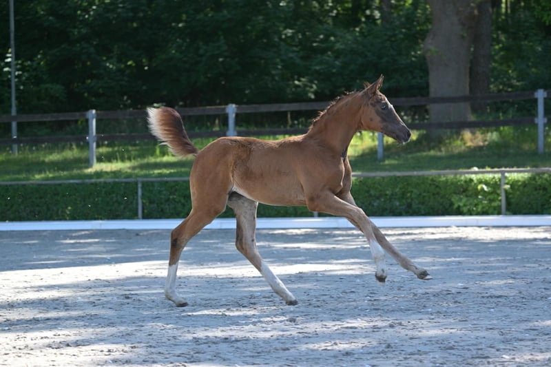 Schon jetzt überzeugt dieses langbeinige Stutfohlen durch einen ausdrucksstarken Bewegungsablauf mit viel Schub aus der Hinterhand, taktsicheren Grundgangarten und einem modernen Exterieur. Sie zeigt sich im Umgang menschenbezogen, aufgeweckt und mit einem klaren Kopf - ideale vorraussetzungen für Sort und Zucht.
