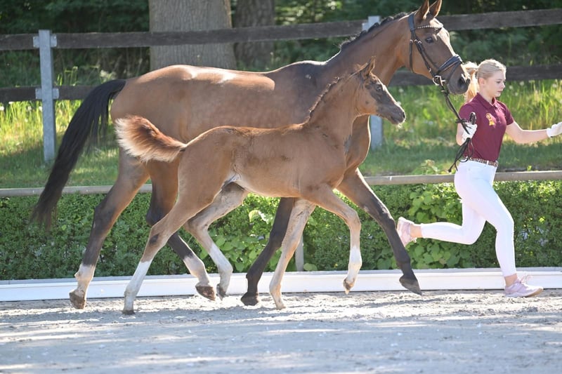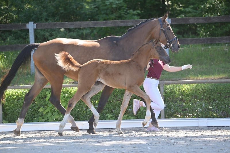 Déjà, ce poulain femelle aux longues jambes impressionne par son mouvement expressif avec beaucoup de propulsion depuis l'arrière, des allures de base rythmées et un extérieur moderne. Elle se montre sociable, éveillée et avec un esprit clair - des conditions idéales pour le sport et l'élevage.