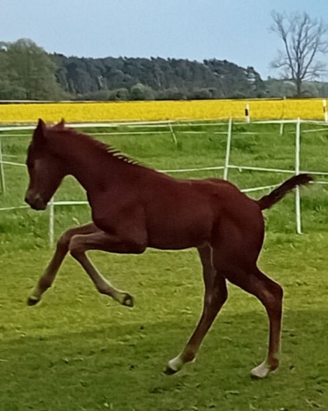 Zum Verkauf steht eine elegante 2-jährige Stute von Comanchero (v. Comme Prèvu - dem Dreiviertelbruder zu Comilfo Plus (Christian Ahlmann)) aus einer Halbblutstute von Chap I (v. Cellestial), welche sich locker und leichtfüßig in der Bewegung zeigt. Die junge Dame (geb. 04/2024) besticht nicht nur durch ihre beeindruckende Erscheinung in besonders schicker fuchsfarbener Jacke sondern auch durch ihren Charme und liebenswerten Charakter. Vater Comanchero, der bei den Oldenburger Hengsttagen 2021 gekört wurde, präsentiert sich ausgestattet mit großer Übersicht, unendlichem Vermögen und voller Kraft. Seine raumgreifende Galoppade und sein schicker Typ machen ihn zum absoluten Hingucker. Gepaart mit bester Rittigkeit und Einstellung ist er auf Hof Sosath die große Hoffnung für den schweren Springsport. In seinem ersten Turnierjahr gewann Comanchero mit 8,6 die Einlaufprüfung zum Championat der vierjährigen Springpferde in Rastede und platzierte sich im Finale in seiner ersten Springpferde L. Den Kurz-Veranlagungstest in Vechta absolvierte er als bester vierjähriger Hengst mit der Gesamtnote 8,44. 2023 qualifizierte sich Comanchero für das Bundeschampionat und platzierte sich in Springpferdeprüfungen bis zur Klasse M. 2024 konnte Comanchero an die Erfolge des letzten Jahres anknüpfen und sich mehrfach in Springpferdeprüfungen der Klasse M mit Wertnoten bis 8,7 hochplatzieren. Er qualifiziert sich außerdem in Westergellersen für das Bundeschampionat der sechsjährigen Springpferde. Im Rahmen der Oldenburger Hengsttage 2025 wurde Comanchero zum Hauptprämiensiegerhengst des Springpferdezuchtverbandes Oldenburg-International gekürt. Weitere Informationen zum Vater befinden sich unter: https://sosath.com/de/hengste/detail/comanchero Der älteste Nachkomme der Mutter war bereits in Youngster-Prüfungen bis 1,35 m Springen erfolgreich unterwegs und wurde in die USA verkauft. Caleas Mutter vererbt ihren Nachkommen Vermögen und eine sehr gute Technik am Sprung sowie besonderen Schick. Erfolgsstute Chakaria (2024 siegreich im Rolex Grand Prix in Aachen) von Europameister André Thieme hat ebenfalls Chap I als Vater.