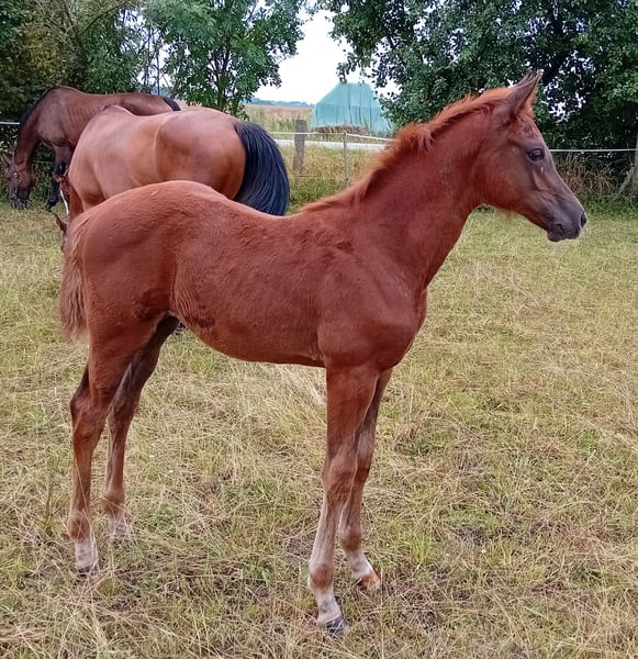 For sale is an elegant filly by Comanchero (by Comme Prèvu - the three-quarter brother to Comilfo Plus (Christian Ahlmann)) out of a half-blood mare by Chap I (by Cellestial), who is loose and light-footed in movement. The young lady not only impresses with her stunning appearance in a particularly chic dark chestnut jacket, but also with her charm and lovable character. Sire Comanchero, who was licensed at the 2021 Oldenburg Stallion Days, presents himself with a great overview, infinite ability and full of power. His ground-covering canter and chic type make him an absolute eye-catcher. Coupled with the best rideability and attitude, he is the great hope for heavy show jumping at Hof Sosath. In his first show year, Comanchero won the warm-up test for the championships for four-year-old show jumpers in Rastede with a score of 8.6 and placed in the final of his first elementary class show jumper test. He passed the short predisposition test in Vechta as the best four-year-old stallion with an overall score of 8.44. In 2023, Comanchero qualified for the Bundeschampionat and placed in tests for young show jumpers up to medium (M) level. This year, Comanchero was able to build on last year's successes and has already placed highly several times in medium (M) level tests for young show jumpers with scores of up to 8.7. He also qualified for the Bundeschampionat for six-year-old show jumpers in Westergellersen. Further information on the sire can be found at: https://sosath.com/de/hengste/detail/comanchero The dam's oldest offspring has already competed successfully in youngster classes up to 1.35 m and was sold to the USA. Calea's dam passes on to her offspring ability and a very good jumping technique as well as special elegance. Successful mare Chakaria (victorious in the 2024 Rolex Grand Prix in Aachen) by European Champion André Thieme also has Chap I as her sire. For further information or to arrange a viewing appointment, please do not hesitate to contact us.