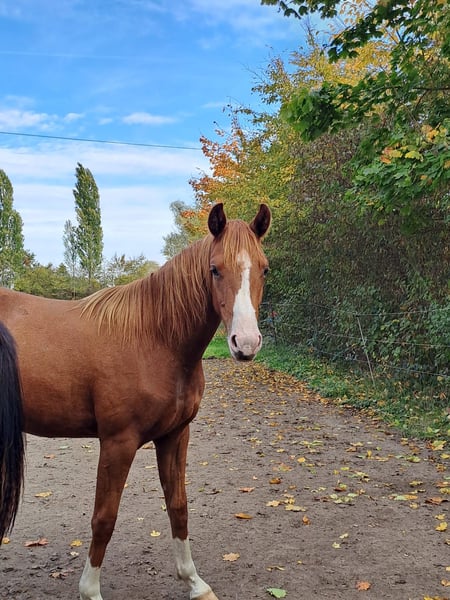 Elegante zweijährige Stute. Schick mit vier weißen Beinen. Nur in fördernde Hände zu verkaufen. Sehr brav im Umgang. Regelmäßig beim Schmied. Wächst in kleiner Herde mit einem gleichaltrigen Fohlen und 3 älteren Stuten auf.