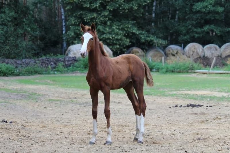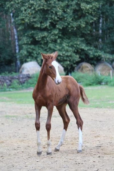 For sale is a 2.5-year-old chestnut mare, a promising prospect for the sport with an impressive, extraordinary presence and excellent movement potential. (She was a champion foal at the championships.) This young mare consistently presents herself with a clear head, is human-oriented, and possesses a strong nerve. She is curious, fearless, and shows her best both in daily handling and on the pasture. She is also farrier- and loading-trainable. As a promising sporthorse, she already demonstrates three very good gaits, indicating a successful future in dressage. She is developing appropriately for her age and is still untrained. With her striking, luminous chestnut color and harmonious build, she is truly eye-catching. She is healthy, free of vices, and comes from top bloodlines. We are seeking an ambitious buyer (breeder or competitive rider) for this raw diamond, someone who recognizes her potential and is willing to invest time, patience, and expertise to further develop her.