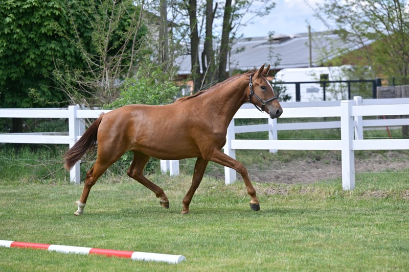 Highly promising young dressage horse Pure movement! This 2-year-old daughter of VA BENE, a successful S***-level dressage competitor, impresses with her powerful stride. Her dam, the state premium and Brillantring mare Quinta B, achieved excellent results in mare performance tests and has placed in young horse dressage competitions. Her full brother is successful at S-Dressage level. From her direct maternal line, the Grand Prix-winning Fürstano B also descends. Her half-sister was also awarded the Brillantring at the state premium show and has won in dressage horse classes. Four generations of state premium mares. Directly from the breeder!