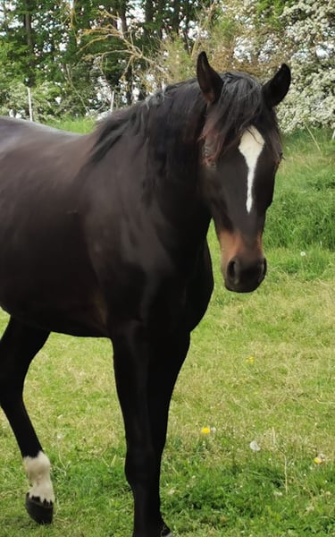 Deze jonge merrie is vanwege haar afstamming geschikt voor dressuur en fokkerij.