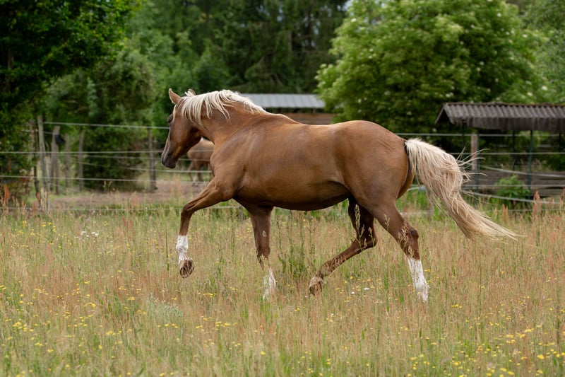 Carrie Forbes, affectionately known as "Furby," combines an excellent movement scope with an absolutely stunning dark palomino color. She was born on our farm, grew up robustly in a mixed-age herd, and is now gradually ready for further challenges. Her sire, Belvedere, a son of Belissimo, achieved a top-ten placement at the World Championships for Young Dressage Horses with Stefanie Wolf and later moved to the USA, where he is trained by Nick Wagman. Wagman considers him a potential candidate for the 2028 Olympic Games in his home country. Furby's dam, Cortess, produced numerous champion foal candidates, including the state premium mare Calamity Jane v. Bonds, who placed 4th in the dressage-oriented foal class at the German Foal Championship in Lienen and qualified for the Bundeschampionat at three years old. Furby is an alert, ambitious horse with a strong sporting drive, which is why we hope to place her in competent, supportive hands. She is also highly interesting for breeding, as she passes on her lightening cream gene 50% of the time, thus enabling the breeding of Palominos and Buckskins.