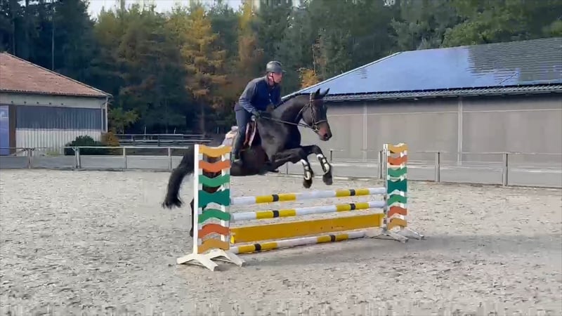 We are offering a beautiful dark bay mare that reliably jumps courses of approximately 1.10 meters. She is very well-balanced and confidently performs flying changes. Joyce has an excellent jumping style, making her suitable as a hunter.
