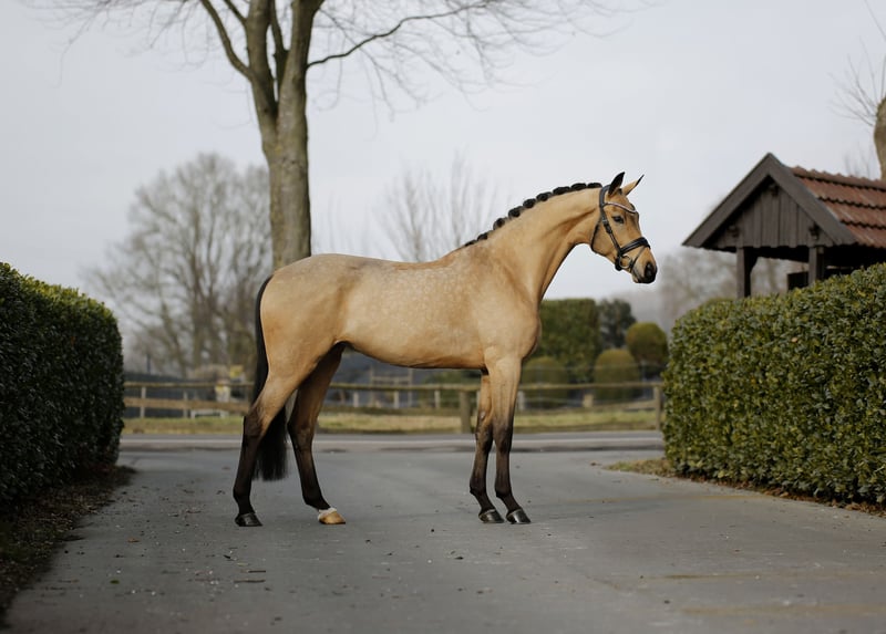 A rarity in every sense! An outstanding dressage prospect dressed in a striking golden coat with an impressive presence. Excellent riding comfort, combined with optimal development potential, superb basic quality, and a very good work ethic, make this young, still unspoiled young horse a highly interesting offering for sport and possibly future breeding. Easy to handle and already ridden by children and teenagers. Sold privately with a recent inspection (including back, neck, and poll).