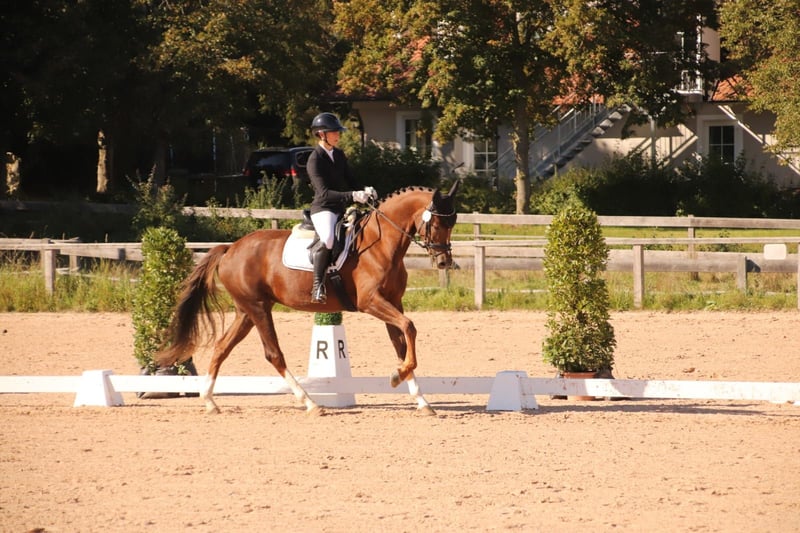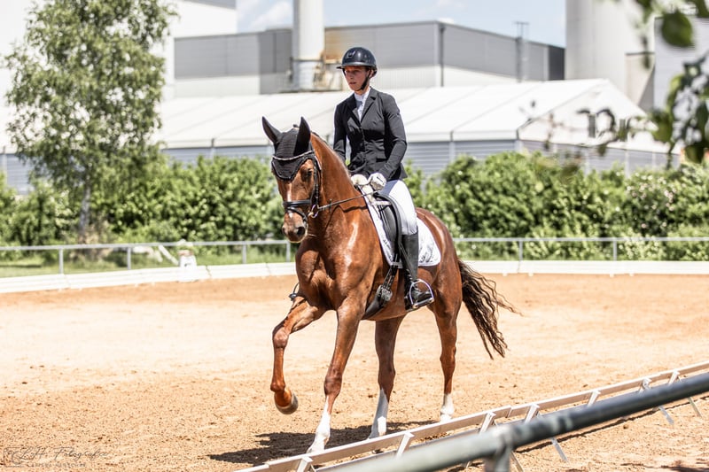 For sale: Elegant dark chestnut mare – German sport horse We are offering a beautiful German sport horse mare, born in 2020. Standing at an impressive 16.1 hh, she combines strength, elegance, and expressiveness. Our homebred mare, Tonia BL, is available – an exceptionally talented and striking young mare with great potential for upper-level dressage. Descended from Fürst Nymphenburg x Topas (son of the legendary Totilas), she embodies excellent rideability, a balanced temperament, and three above-average basic gaits in a modern, athletic type. This elegant chestnut mare impresses with lightness of movement, eagerness to learn, and expressiveness. Tonia has successfully competed in dressage horse tests of class A and, in her first L-level dressage young horse test—without extensive specific preparation—achieved an outstanding score of 7.22. She consistently shows motivation and focus during training. She already masters flying changes, shoulder-in, and volte exercises confidently, and traversals in trot and canter come easily to her. But Tonia is not only at home in the dressage arena: She demonstrates talent and awareness over fences, combined with a quick, alert front leg and a lot of enthusiasm for work. During a basic jumping test, she performed confidently and with great composure—truly a versatile partner for any rider. In daily handling, Tonia is straightforward, well-behaved, and very people-oriented. She is easy to ride, honest in character, and well-suited for ambitious amateur riders. Another highlight: Tonia has already foaled a healthy, typey foal—a further testament to her quality, also as a future broodmare. A mare that impresses in every way—for riders seeking lightness, potential, and charm in one horse. 📍 Location: Ausbildungsstall Berner-Leis, Aurach (Middle Franconia) 📞 Videos & more information: 0155 6014 9005