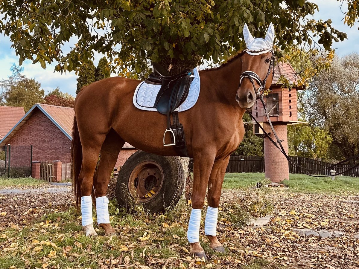 Sprzedam niemieckiego konia sportowego – elegancka kasztanowa klacz Na sprzedaż wystawiam klacz Daria, elegancka i wyrazista kasztanowa klacz, urodzona 04.04.2019, o wzroście 173 cm, z urodzeniem pochodzącym z dyscypliny ujeżdżeniowej (ojciec: Don Royal). Pochodzi bezpośrednio od hodowcy i wyróżnia się bardzo dobrymi podstawowymi chodem, poprawną budową i przyjemną jezdnością. W tym roku Daria wydała na świat zdrowe i typowe źrebię, które podczas pokazu źrebiąt zajęło miejsce rezerwowego zwycięzcy – co jest wyraźnym dowodem jej mocnej linii hodowlanej i jakości jako matki. Daria jest zarówno w obsłudze, jak i pod siodłem, niezwykle spokojna, rzetelna i bezproblemowa. Zawsze wykazuje się dużym zaufaniem do człowieka, jest spokojna i o łagodnym temperamencie – to koń, który codziennie sprawia radość. Lokalizacja: 15374 Müncheberg. W razie zainteresowania i dodatkowych pytań chętnie służę informacją. Możliwa jest wizyta i jazdy próbne po wcześniejszym umówieniu.