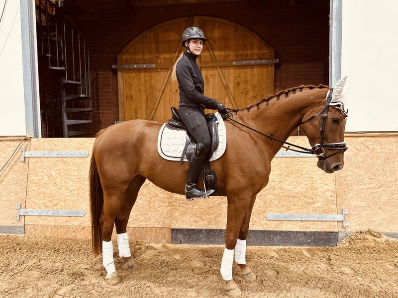 For sale: Elegant Chestnut Sport Horse Mare We are offering Daria, an elegant and expressive chestnut mare born on April 4, 2019, with a height of 173 cm and a dressage-oriented pedigree (Sire: Don Royal). She comes directly from the breeder and impresses with excellent basic gaits, correct conformation, and a pleasant rideability. This year, Daria has foaled a healthy and typy foal, which was awarded Reserve Champion at the foal show—an clear indication of her strong breeding line and her qualities as a broodmare. Daria is exceptionally well-behaved, reliable, and uncomplicated both in handling and under saddle. She consistently shows a human-oriented, calm, and balanced temperament—an horse that brings joy every day. Location: 15374 Müncheberg. If interested, or for further information, I am happy to assist. Visits and trial rides are possible by arrangement.