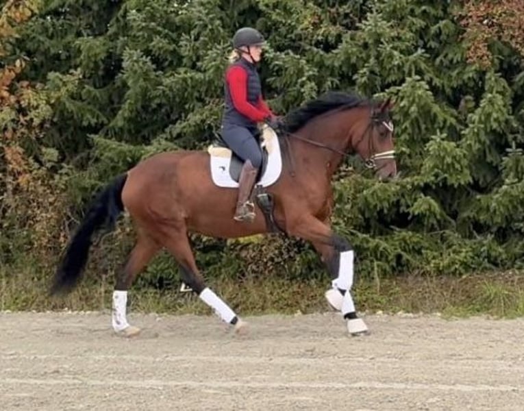 Cette jument Topas expressive recherche un nouveau foyer où elle pourra briller. « Lizzy » est en notre possession depuis décembre 2024 et a été doucement formée au niveau A durant l'été. Nous avons commencé à travailler avec elle en petites séances de saut L. Lizzy connaît le travail avec des barres au sol et des cavaletti, et elle avance courageusement en terrain. Pour des raisons de temps, elle n’a pas encore participé à des concours cette année, mais elle est déjà inscrite à la Fédération Équestre Nationale (FN) et pourrait débuter immédiatement. Lors des entraînements en extérieur, elle s’est toujours montrée très détendue et sans peur. Elle est enregistrée dans le livre d’élevage du Verband Baden-Württemberg du sport équestre. Elle possède un caractère très agréable et cherche toujours à plaire à son humain. Elle adore être brossée et câlinée. Chez nous, Lizzy passe la journée dans un petit troupeau de juments sur le paddock ou en pâture, et la nuit dans son propre box. Nous souhaitons lui offrir un foyer où elle sera encouragée et où elle recevra toute l’attention de son propriétaire. Lizzy est entièrement vaccinée, a toujours été vermifugée régulièrement (de manière sélective) et voyage très calmement en van. De bonnes radiographies sont disponibles. En raison de sa taille et de son âge, elle n’est pas encore adaptée aux enfants, et les débutants ou les reprises doivent être accompagnés d’un entraîneur ou d’un préparateur. Pour une rencontre avec une séance d’essai, une participation de 25 euros en espèces est exigée immédiatement.