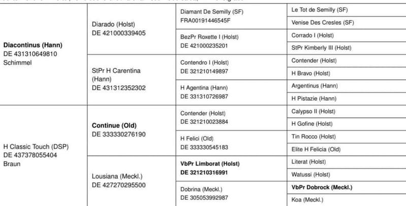 Verkaufe meine ca 168 große Stute von Diacontinus aus einer Continue - Limborat. Sie ist 2018 geboren, wurde 3j kurz angeritten und war dann in der Zucht. Die Stute ist brav im Umgang, freundlich und gelehrig. Sie wird gut tragend und ist eine gute Mutter. Ihr Mutter classic Touch war selbst mit einer Juniorin bis zur Klasse S platziert. Die Stute wird aufgrund von Verkleinerung verkauft, siehe auch unsere anderen Stuten.