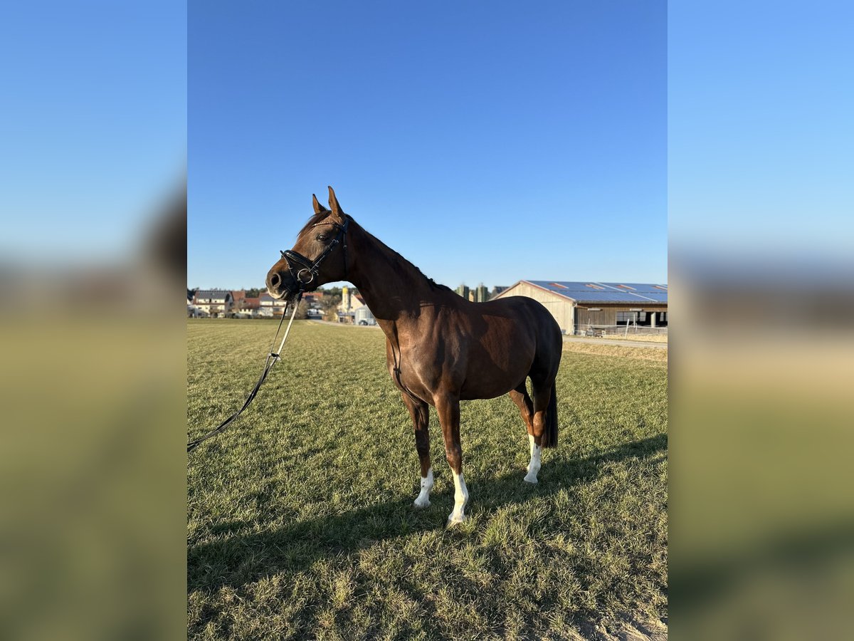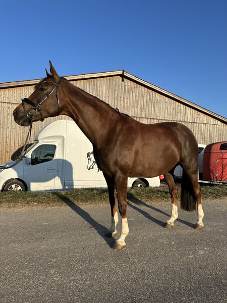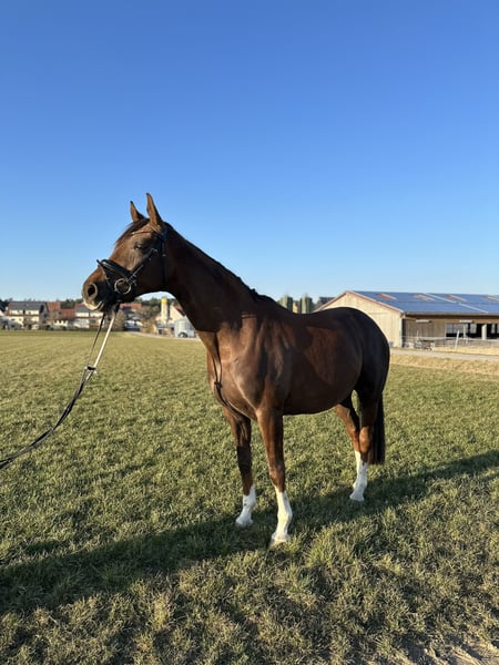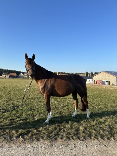 Unsere bildhübsche Forever My Rose, eine 2019 geborene Deutschen Sportpferd Stute,verzaubert mit ihrem ausdrucksstarken Erscheinungsbild und ihrem tollen Charakter mit einem Stockmaß von ca. 1,68 m. Die elegante Dunkelfuchsstute begeistert nicht nur durch ihre traumhafte Farbe, sondern auch durch ihre üppige Mähne und ihren vollen Schweif – ein echter Blickfang. Rose ist leichtrittig, angenehm zu sitzen und geht selbstständig und korrekt am Zügel. Sie ist allerdings nicht für Anfänger geeignet, da man korrekt und ruhig sitzen sollte und sie eine ruhige Hand braucht. Im Umgang zeigt sie sich absolut unkompliziert, menschenbezogen und verschmust. Sie liebt Aufmerksamkeit und genießt jede Streicheleinheit. Aufgrund eines Befundes (verkalkter Schleimbeutel) ist sie nicht mehr für den Turniersport geeignet!! Daher wünschen wir uns für sie einen liebevollen Platz als Freizeitpartnerin oder in fördernden Händen für die Zucht. Wer eine treue Seele mit viel Charme und Herz sucht, wird in Rose eine ganz besondere Begleiterin finden.