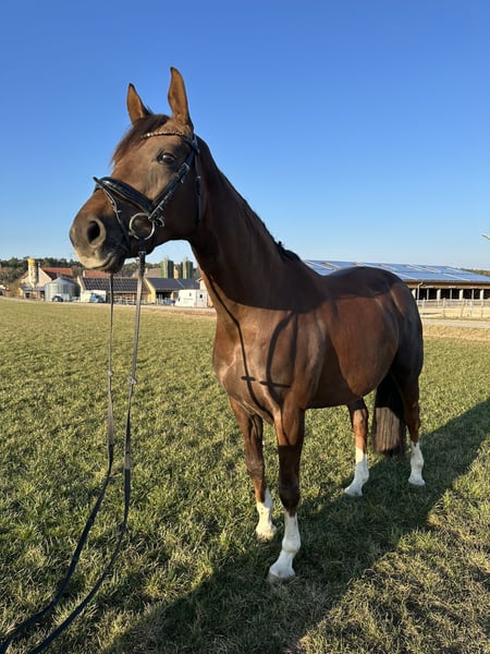 Our stunningly beautiful Forever My Rose, a 2019-born German Sport Horse mare, captivates with her expressive appearance and excellent character, standing approximately 16.1 hh. The elegant dark chestnut mare impresses not only with her breathtaking color but also with her abundant mane and full tail – truly a eye-catcher. Rose is easy to ride, comfortable to sit on, and moves independently and correctly on the bit. However, she is not suitable for beginners, as a correct and calm seat is essential, and she requires a steady hand. In handling, she is absolutely straightforward, human-oriented, and affectionate. She loves attention and enjoys every stroke. Due to a medical condition (calcified bursa), she is no longer suitable for competitive riding!! Therefore, we are looking for a loving home for her as a leisure partner or in a nurturing environment for breeding. Anyone seeking a loyal soul with lots of charm and heart will find a very special companion in Rose.