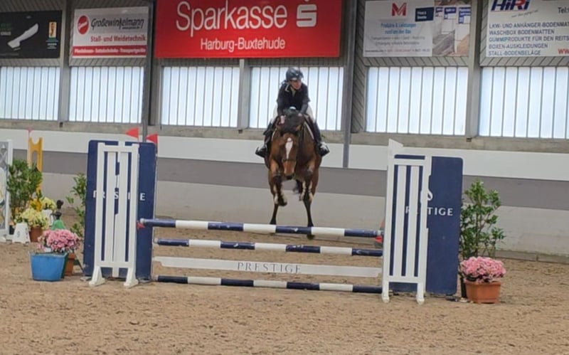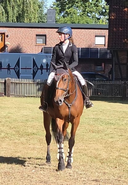 Oferujemy utalentowaną klacz o doskonałym rodowodzie – Vivant van de Heffinck x Balou du Rouet Ta piękna klacz zachwyca nie tylko swoim typem i poprawną budową, ale przede wszystkim ogromnym potencjałem skokowym i wybitnym rodowodem: Vivant van de Heffinck – odnoszący sukcesy na arenie międzynarodowej, znany z rzetelności, skoczności i charakteru – łączy siły z sprawdzonym Balou du Rouet, symbolem osiągnięć, techniki i sportowego ducha. Vicky prezentuje się z elastycznymi ruchami oraz dużą sprężystością, siłą odbicia i refleksami na skoku. Na początku była wykorzystywana w hodowli, następnie delikatnie wyprowadzona do jazdy przez młodą dziewczynę i przygotowana do kariery jako skoczek. Na swoim pierwszym turnieju treningowym osiągnęła dobre wyniki. Pokazała się jako bardzo opanowana i pewna siebie na obcym terenie, a obsługa była dla niej łatwa. To nas bardzo ucieszyło i z chęcią czekamy na więcej. Obecnie bez problemu pokonała również w pierwszym starcie w konkursie typu Clear Round w klasie A. Vicky dobrze radzi sobie w podstawowym treningu, potrafi pokonać parkur pod jeźdźcem i odważnie oraz bez lęku wchodzi w teren, także solo. Pod jeźdźcem jest bardzo rzetelna, zmotywowana i gotowa do pracy, co czyni ją świetną kandydatką na przyszłość w wyższym sporcie skokowym. Pasuje zarówno dla ambitnych amatorów, jak i profesjonalistów, będąc prawdziwym sportowym sercem z dużą perspektywą rozwoju. Można ją również wyobrazić sobie w konkursach wszechstronnych lub u wrażliwych, wymagających rekreantów. W codziennym kontakcie jest kluzem, a z innymi końmi dogaduje się świetnie. Niemniej jednak, nie jest jeszcze końcem dla początkujących, ponieważ jest jeszcze na początku swojej kariery i wymaga delikatnego traktowania. 7-letnia klacz DSP, v. Vivant van de Heffinck x Balou du Rouet, 1,67 m, dostępne badania kliniczne i RTG. Film: https://youtu.be/iRFBCLImq7c?si=9LTYTU3JEGdBhsNU https://youtu.be/OcrIE6DYJAE?si=ka89kY2ilQFRszqT „Filmy, fragmenty treningowe i dodatkowe informacje o naszych końiach dostępne są również na Instagramie: [maresi_lange]. Tam można znaleźć więcej szczegółów i zbliżenia na rozwój koni.“ Więcej koni na mojej stronie MaresiLange.de lub na życzenie. Opis konia opiera się na subiektywnych odczuciach i doświadczeniach z naszej strony i nie stanowi gwarancji ani zapewnienia określonych cech. Jazda próbna odbywa się na własne ryzyko. Za prezentację i jazdę próbną konia pobieramy opłatę w wysokości 30 euro, która zostanie odliczona od ceny zakupu.