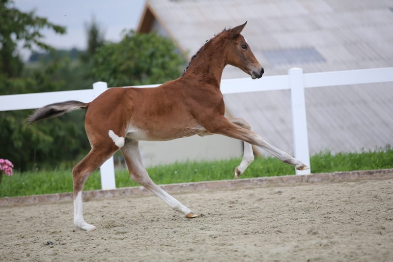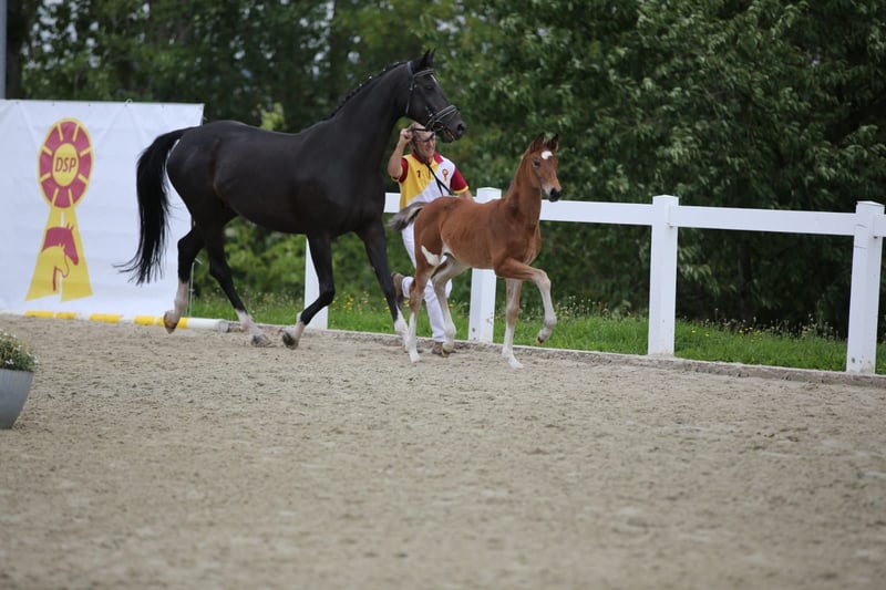 For sale is a particularly charming filly that immediately catches the eye, not only because of her distinctive spot on her hindquarters but also due to her friendly and trusting nature. She impresses with her trust in humans and her powerful, elegant movement. She is a daughter of the Oldenburg stallion Viva Vitalis OLD, who won this year's Bundeschampionat for six-year-old dressage horses in Warendorf with an outstanding final score of 8.96. The dam line traces back to De Janeiro and combines excellent qualities in type, movement quality, and rideability. The foal also showcased these traits during her participation in the foal championship. This filly offers ideal conditions for sport or breeding and is guaranteed to be a focal point due to her special appearance and loving character. Viewings are possible by appointment.