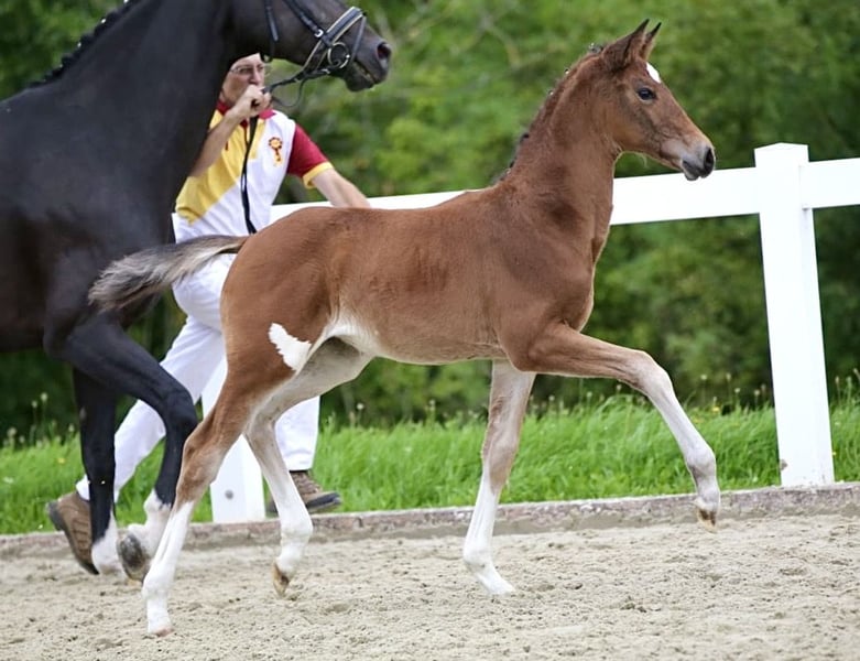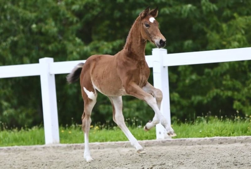 Zum Verkauf steht ein besonders charmantes Stutfohlen, das sofort ins Auge fällt und das nicht nur wegen ihres auffälligen Flecks an der Hinterhand, sondern auch wegen ihres freundlichen und zutraulichen Wesens. Sie begeistert durch Vertrauen zum Menschen und ein bewegungsstarkes, elegantes Auftreten. Sie ist eine Tochter des Oldenburger Hengstes Viva Vitalis OLD, der dieses Jahr das Bundeschampionat der sechsjährigen Dressurpferde in Warendorf mit der herausragenden Endnote von 8,96 gewann. Die Mutterlinie führt auf De Janeiro zurück und vereint ausgezeichnete Eigenschaften in Typ, Bewegungsqualität und Rittigkeit. Dies zeigte das Fohlen auch bei ihrer Teilnahme am Fohlenchampionat. Dieses Stutfohlen bietet ideale Voraussetzungen für Sport oder Zucht und wird durch ihr besonderes Auftreten und ihren liebevollen Charakter garantiert zum Blickfang. Besichtigungen sind nach Absprache möglich.