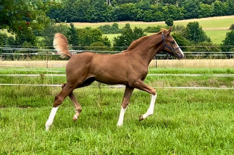 Energetic, harmoniously built, curious filly by Esmeraldo, Holsteiner licensing champion of show-jumping stallions. The dam, Nevada, comes from a Westphalian breeding line of Debütant and Ehrentusch on the maternal side. The beautiful filly is growing up well cared for with two other mares and foals, is halter-trained, and accustomed to human interaction. The best prerequisites for ambitious show-jumping riders. Due to time and capacity reasons, the mother is also for sale as a broodmare, currently having her 3rd foal.