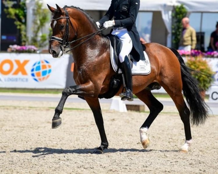 Un stallone eccezionale di 12 anni, approvato, che unisce in modo particolare esperienza sportiva, massima maneggevolezza e una presenza naturale impressionante. Ha già dimostrato il suo valore a livello internazionale ed è stato partecipante ai Campionati del Mondo dei giovani cavalli. Le sue classifiche fino a Inter II ne evidenziano la qualità e uno sviluppo sicuro verso il livello Grand Prix. Il suo passo convince per potenza, elasticità e una marcata tendenza a salire, soprattutto nel galoppo. Si distingue per espressività, sicurezza e una presenza carismatica in arena – un cavallo che cattura facilmente l’attenzione. Nonostante il suo status di stallone, si mostra nel quotidiano deciso, stabile di nervi e molto collaborativo. La sua maneggevolezza e il suo atteggiamento positivo lo rendono un partner affidabile per le più alte esigenze sportive. Un cavallo per intenditori – per cavalieri che, oltre alla qualità e all’esperienza, cercano qualcosa di speciale.