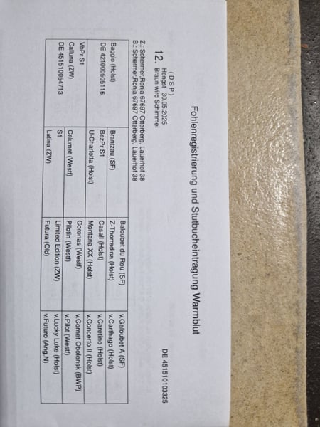 **Annuncio di vendita: Cavallo Sportivo Tedesco - Stallone** In vendita c'è un promettente stallone, un Cavallo Sportivo Tedesco, nato a maggio 2025. Bacardi impressiona non solo per il suo aspetto attraente, ma anche per i suoi movimenti elastici e agili. Proviene da Baggio×Calumet ed è stato premiato con l'oro alla mostra dei puledri. Inoltre, è stato nominato puledro vincitore. Al Campionato dei puledri ha ottenuto punteggi costantemente superiori a 8 (media 8,12). Una vasta gamma di stalloni di successo come Cornet Obolensky, Baloubet du Rouet, Casall e Limited Edition è presente nel suo pedigree. Bacardi conosce l'ABC dei puledri e cresce in un gruppo sociale. Può essere ceduto anche come gelding. Sua sorella piena (3 anni) ha mostrato buone maniere e tecnica nel salto libero ed è attualmente in fase di montaggio delicato.