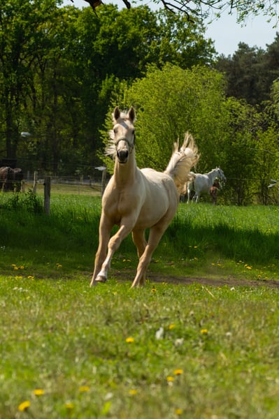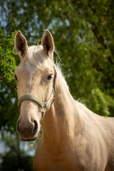 Bright Benicio (nickname "Brighty") is an incredibly likable guy with correct conformation and very good basic gaits, for which he was awarded a premium and qualified for the championship at the DSP foal show in Neustadt/Dosse 2024. (Due to organizational reasons, we could not attend the championship.) Through his Benicio bloodline, Brighty brings excellent dressage and rideability potential. The special color Palomino is an additional bonus that makes him an absolute eye-catcher. His sire, Ben Benicio, is currently on a successful path, collecting wins and placements in S-class dressage competitions - now also at the international level. Brighty is halter-trained and is already familiar with walks in the woods and playful groundwork with a gym ball and more. He is very open-minded and well-behaved.