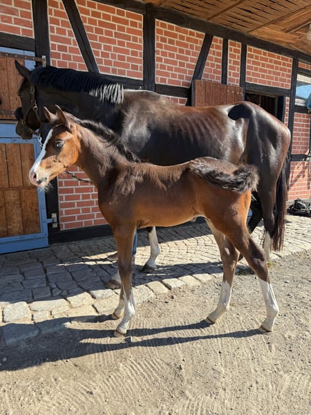 Auffälliges, typvolles Hengstfohlen aus sportlich interessanter Anpaarung Am 11. Juli 2025 geboren, überzeugt dieses moderne, korrekt aufgebaute Fohlen bereits heute mit kraftvollem Bewegungsablauf, sportlicher Aufmachung und sehr auffälliger Zeichnung. Vater: Bon Esprit (Gestüt Schönweide) – vielversprechender Junghengst mit exzellentem Interieur, drei überdurchschnittlichen Grundgangarten und hohem sportlichen Potenzial. Muttervater: Goldberg (Vitalis x San Remo) – international anerkannter Vererber, bekannt für Rittigkeit, Leistungsbereitschaft und Ausstrahlung. Dieses Hengstfohlen besticht durch seinen modernen Typ mit guter Oberlinie und korrektem Fundament • bewegungsstark mit viel Elastizität und Schulterfreiheit • optisch deutlich am Großvater Goldberg orientiert • menschenbezogen, unkompliziert im täglichen Umgang • schmiede- und verladefromm Interessant für • Sport: Dank seiner Abstammung und Bewegungsqualität ein aussichtsreicher Kandidat für die Dressurbahn mit Perspektive für höhere Klassen. • Zucht: Interessante Blutführung (Bon Esprit x Goldberg), die Typ, Leistungsbereitschaft und moderne Reitpferdequalität verbindet.