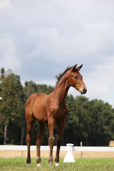 Here we offer a very special rough diamond from our own breeding and raising: BORDEAUX x FLORENCIO I x RASCALINO x DE NIRO x ARGENTINUS 3 siblings of his mother are internationally successful at PSG/Inter I level. 1 brother of the yearling has multiple S* placements and has won PSG. 1 sister of the yearling has completed the mare performance test with an external score of 9.50. The colt is tall, with a realistic final height of 170 - 172 cm. He stands on very correct foundations, which speaks for durability. He is clear-headed and exceptionally friendly towards humans. Currently, he shows no stallion behavior. He lives in a mixed-age herd with breeding mares and other yearlings in a 24/7 open and active stable with pasture. Due to the sporting successes in the direct maternal line, a very promising future can also be expected for this yearling. If needed, he can remain here in his familiar herd for further raising, but with castration at the end of 2025.