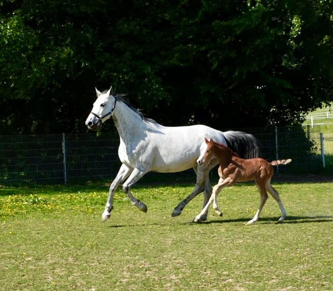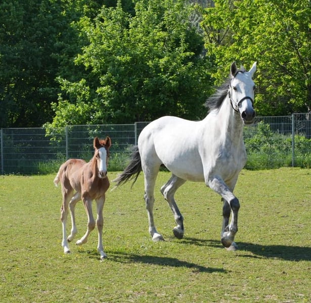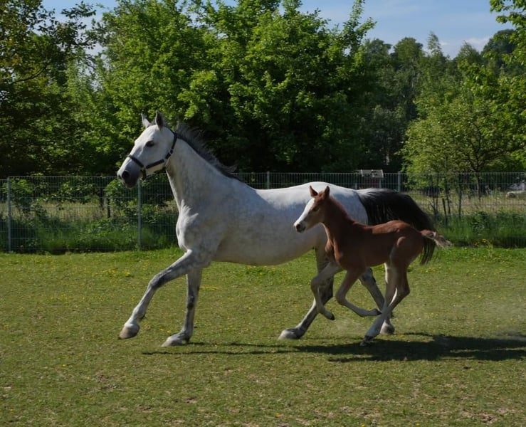 Due to stock reduction, mare and foal are for sale as a pair or individually. Foal born on 01.05.2025 Mother born on 19.05.2015 (currently has her 4th foal) Maternal Grandmother: 1 successful offspring by Conthargos SPR S, 1 successful offspring by Heops/T. SPR M Maternal Great-Grandmother: several M and S show jumping horses, 1 offspring in dressage M