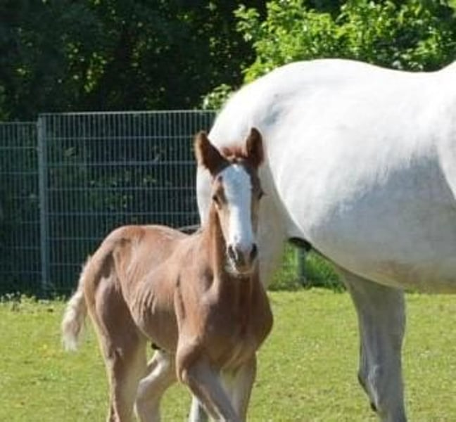 Wegen Bestandsreduzierung Stute und Fohlen im Doppelpack oder einzeln zu verkaufen. HF v. 01.05.2025 Mutter geb. 19.05.2015 (hat jetzt das 4. Fohlen) MM: 1 erf. NK v. Conthargos SPR S, 1 erf. NK v. Heops/T. SPR M MMM: mehrere M und S Springpferde, 1 NK DRE M