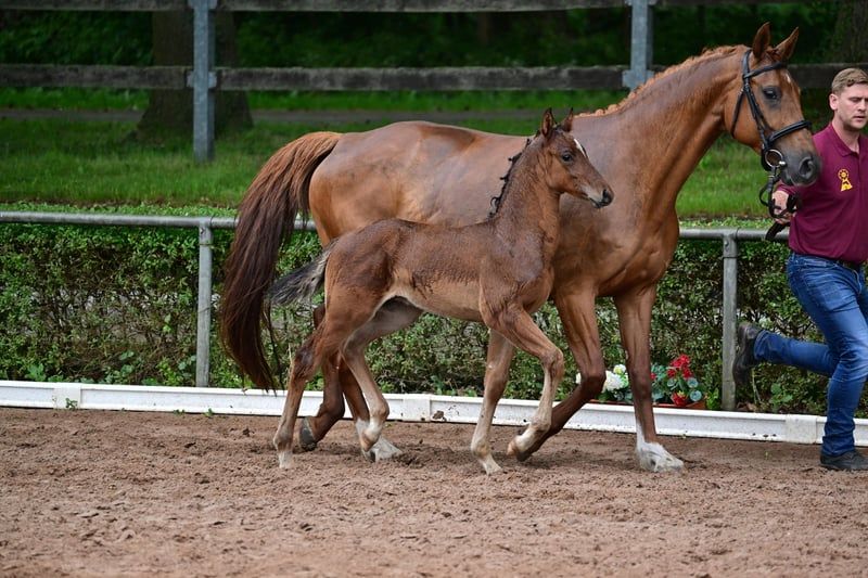 Charly - questo bellissimo e dinamico stallone di sport tedesco, nato nel 04.2024, colpisce per la sua elegante apparizione di colore baio e raggiungerà un'altezza finale prevista di circa 168 cm. Un vero colpo d'occhio grazie al suo aspetto tipico e alla sua conformazione corretta. Charly cresce in un gruppo sociale, è stato sverminato e conosce già il maniscalco e il veterinario. Mostra un carattere vivace e socievole, è curioso e sempre affettuoso. Conosce già l'ABC dei puledri e cammina rilassato al guinzaglio accanto a sua madre. Il padre di Charly è Cape Calidus (vincitore della prova di prestazione per stalloni ad Adelheitsdorf nel 2022). Sua madre è una figlia di Chap I. (padre della campionessa europea DSP Chakaria). Un fratello pieno della madre di questo puledro ha ottenuto vittorie in S a Balve e Amburgo nel piccolo Derby. Grazie alla sua promettente genealogia nel salto, con un padre che è stato presentato con successo, Charly è un ottimo giovane cavallo per le categorie di salto e un partner promettente per lo sport.