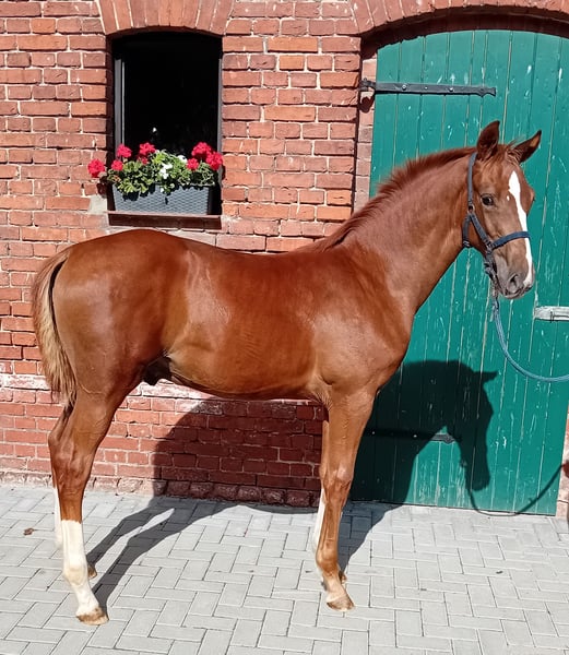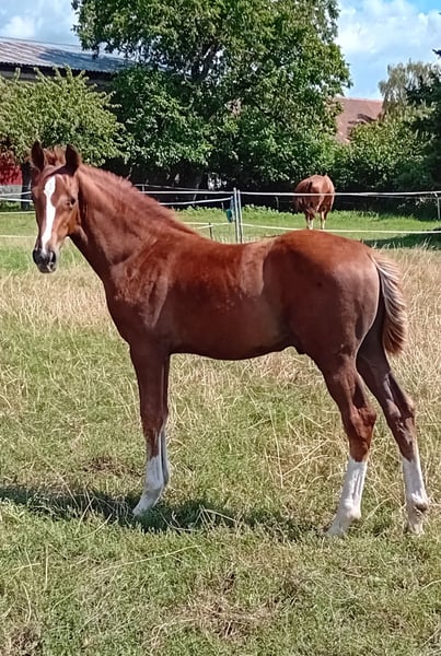 For sale is a promising, typey colt in a chic chestnut jacket. With an expressive appearance, "Diado" presents himself relaxed and light-footed in movement. He is very sociable, has mastered the foal ABC and has a lot of charm. He has an elegant and sporty appearance and, due to his pedigree, offers the best basic prerequisites for high-level show jumping; perhaps even interesting for stallion breeding. Sire DIATHAGO (by Diamant De Semilly - Carthago - Stakkato - Grannus) is a typey top show jumper and an important son of the legendary Diamant de Semilly, who stands out with his excellent jumping manner, elasticity and bascule. He already impressed in the 70-day test in Neustadt (Dosse) with a jumping-oriented final score of 8.6 and was outstanding in free jumping (9.0). Sire Diamant de Semilly was World Champion under Eric Levallois in 2002 and Vice European Champion in 2003 and can point to 71 licensed sons and 191 S-successful offspring. DIATHAGO has been successful under the saddle of Marcus Ehning (5th place in the CSI4* in Valkenswaad and victorious in the World Ranking Jumping in Oslo) and was previously highly successful under Lara Weber in international show jumping competitions up to advanced (S***) level and placed in the CSI2* in Riesenbeck in 2020. The pair won the Westphalian Championships in 2019. To date, the stallion has placed third in the LVM Bavarian Championships for six and seven-year-old show jumpers under Jens Goldfuß in 2017. He also placed in the small final at the World Championships for five-year-old show jumpers. DIATHAGO's offspring inspire with their athleticism and elegance. Among others, he produced the champion jumping foal in Warendorf in 2018. His first offspring have now reached advanced level and can point to international advanced (S) level placings. DIATHAGO is half-brother to the PILOT son PILOTHAGO, who was licensed in 2012. Further information under: https://www.landgestuet.nrw.de/zucht/unsere-hengste/hengst/diathago/ Information on the parent strain: Diado's dam comes from the legendary Landgraf line and was herself successful on the show jumping course up to 1.35 m. She was awarded the DSP premium for her athletic performance. Diado was born on 22.04.2024 and is about to be weaned. If you are interested or require further information, please do not hesitate to contact us.