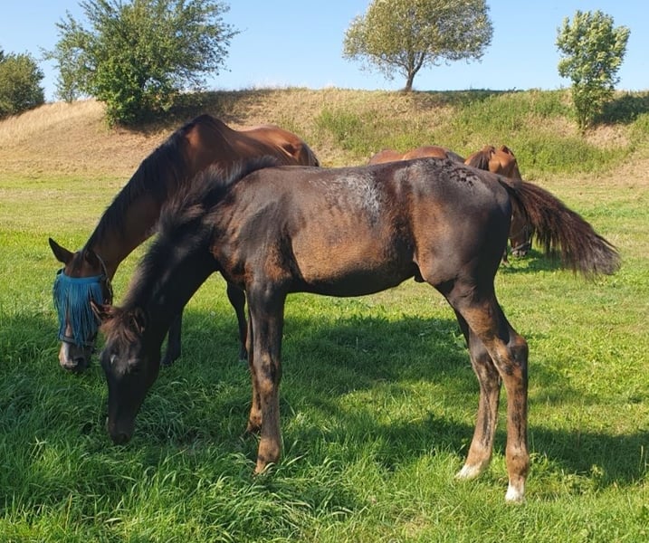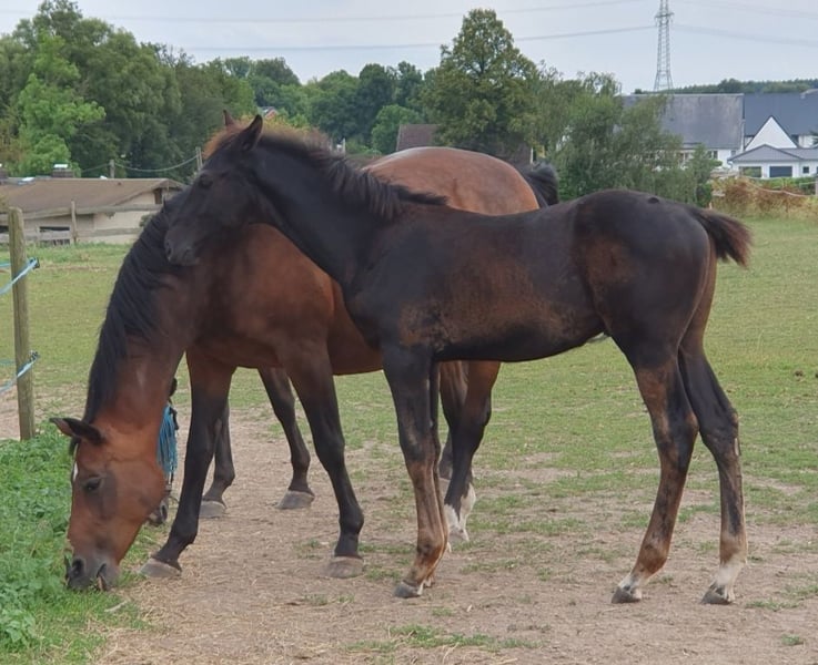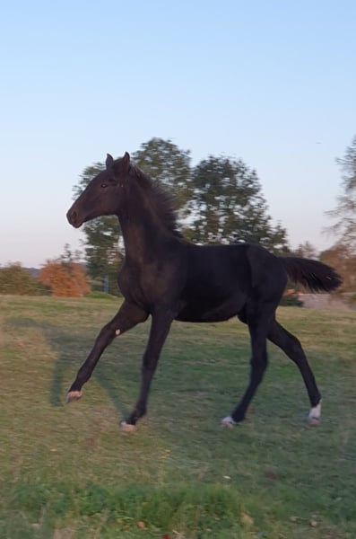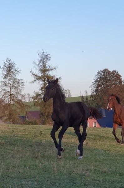 Description: Colorado was born on 10.05.2024, a very smart colt, very long-legged. In the coveted dark jacket. He is very sociable and sweet. Colorado is already over 1.40 cm tall. Awarded as a foal Details of the dam line: Orangina descends from the stallion Antaeus. Antaeus" came third in the stallion performance test in Neustadt/Dosse in 1998, receiving the maximum score of 10.0 for jumping as well as for his willingness to perform and constitution. His sire "Acord II" is considered one of the best show jumping sires of the younger generation. The dam "Arabesque" comes from a very distinguished Hanoverian performance family: not only is she a full sister of "Aramis" (1982 World Cup winner under Mario Deslauriers, Canada), Orangina is descended from the mare family 87/SW48/7 , S family of Ondra 15073 Seller: Fanny Großer 09661 Hainichen Phone: 01743440408 E-Mail: fannygrunwald@gmx.de