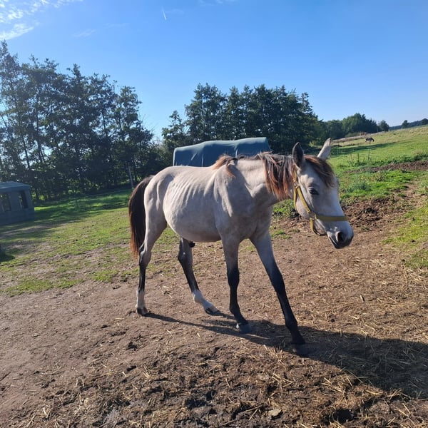 I am selling my nearly 2-year-old grey stallion, "Tayo," with an approximate height of 17.5 hands. He is an absolute dream stallion with wonderful qualities: • Very gentle and affectionate in handling • Familiar with dogs and other animals • Child-friendly and not spooky • Well-socialized • Knows the foal basics (Foal ABC) • Used to pasture turnout He has a lovely temperament and is very easy to handle. The stallion is healthy and lively. Additionally, he is completely gelding-safe. Please feel free to contact me with any questions.