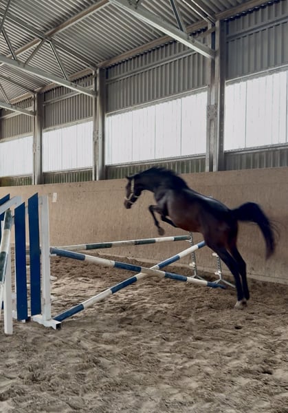 For sale is an exceptionally sweet and uncomplicated 2.5-year-old stallion. He impresses with his charming personality, is well-behaved and easy to handle in daily management, knows lunging and demonstrates confidence, good technique, and talent when free jumping. His sire, Contenaro, stands for willingness to perform, rideability, and excellent jumping ability. Through his dam's sire, Saami xx, valuable Thoroughbred bloodlines are infused, giving him lightness and a correct foundation. Currently, one testicle is retained in the abdomen, which can be further evaluated by a veterinarian as he matures. A fantastic young horse for people seeking an honest, eager-to-learn partner for sport or leisure. For serious inquiries, please contact me for additional information, photos, or videos.