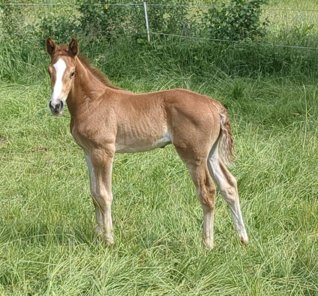 Dieses großrahmige korrekte Hengstfohlen stammt aus eigener Zucht. Er ist sehr schön gleichmäßig gezeichnet, hat 3 sehr gute GGA und eine sehr gute raumgreifende Bergaufgaloppade. Das Fohlen ist sehr umgänglich und beherrscht das Fohlen-ABC. Seine Mutter ist bis 125 cm auf Turnier vorgestellt. Vater Baloucan wird erfolgreich bis S**** auf Turnier vorgestellt.