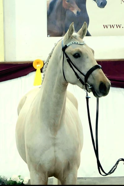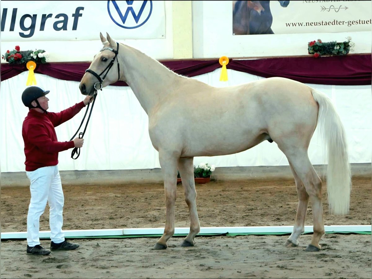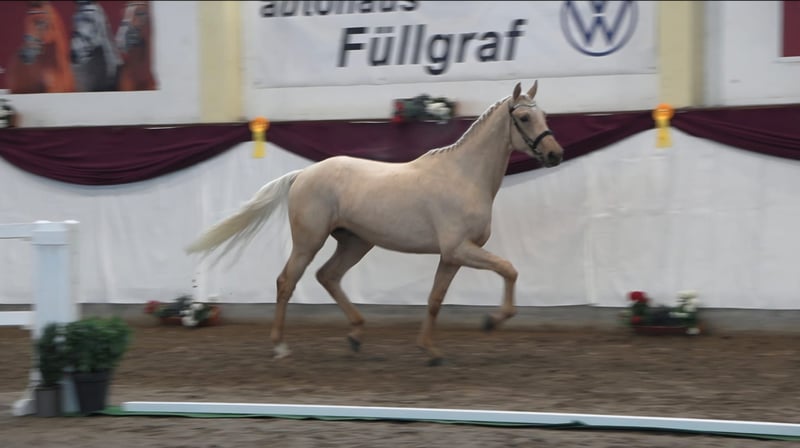 German Sport Horse for Sale – Stallion, born 2023, Palomino From a young age, our shining star impressed: he was the overall champion foal at the foal show in Kränzlin and also won the champion foal title. Even then, the judge was convinced: an outstanding half-blood foal of exceptional quality! In the sought-after Palomino color and with a height of 17.2 hh, he is a true eye-catcher. The stallion has a correct conformation and a harmonious build. Strahlemann F demonstrates very good elastic basic gaits and exhibits a lively trot with significant shoulder freedom. In free jumping, he shows great overview and an impressive scope. He is well-mannered and has a pleasant temperament. His excellent pedigree and pronounced movement talent suggest a promising future in sport or breeding. Strahlemann F is being offered directly from the breeder. He has been raised in a group on large pastures with good care. Radiographs for soundness are available. If interested, we look forward to hearing from you to provide more information and to arrange a viewing.