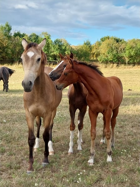 Nous vendons un poulain hongre de grande taille et robuste, issu de l'étalon Holsteiner Chinchero (de la station d'étalons Völz). Il possède une belle galopade en montée, ce qui laisse présager un grand confort d'équitation futur. Le pas et le trot sont également d'une très bonne qualité de base. Il est déjà très grand et costaud, de sorte qu'on peut s'attendre à ce qu'il atteigne au moins 170 cm et qu'il puisse accueillir des cavaliers plus grands sans problème. Sa mère est une jument de reproduction tout au long de sa vie et a toujours produit des poulains primés. Elle est elle-même inscrite comme jument primée de l'association et se distingue par un extérieur marqué par le sang. Par conséquent, on peut également attendre une aptitude pour le sport équestre de concours complet. Un élevage est possible. Une rencontre est également possible à tout moment sur rendez-vous préalable. Nous avons également une demi-sœur de deux ans, issue de l'étalon Holsteiner Esmeraldo, que nous avons actuellement à vendre. Si vous êtes intéressé, je peux vous fournir plus d'informations.
