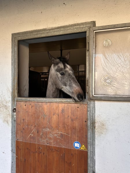 Gray gelding, approximately 16.1 hh, promising pedigree. Honest, brave, and easy to handle. Well-balanced, rhythmic basic gaits with great potential under saddle. Very people-oriented, enjoys interaction, and is curious about everything like a baby. Since summer, he has been jumping small courses, demonstrating honest, powerful jumps with potential for show jumping. In daily handling, uncomplicated: loading, farrier, grooming. X-rays available. 📍 Munich WhatsApp: +49 152 31434794