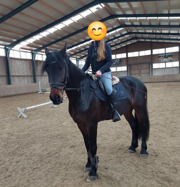 Nous vendons notre hongre de 5 ans, mesurant un peu plus de 1,60 m (cheval de sport hongrois), qui est monté par ma fille (15 ans) depuis presque un an. En dressage, il est à un bon niveau A, et il participe très motivé à l'entraînement de saut d'obstacles. L'entraînement au saut a commencé il y a deux mois, et il saute actuellement environ 80 cm. Lors des sorties en groupe, il se montre détendu et n'est pas effrayé. En main, il se comporte de manière équilibrée et reste calmement au box de pansage, cependant, en raison de son âge, il n'est pas adapté aux cavaliers totalement débutants. Chez le maréchal-ferrant, il se montre très sage. Il connaît le box ouvert et le box avec sortie au paddock, et il a toujours été compatible avec d'autres chevaux jusqu'à présent. Un examen vétérinaire avec des radiographies (sans constat) de l'année dernière est disponible. Pour plus d'informations et des vidéos, n'hésitez pas à demander. Pour l'essai, un montant de 20 EUR est à régler, qui sera déduit du prix d'achat en cas d'achat.