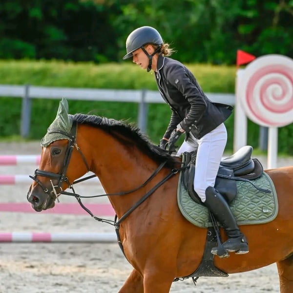 For sale is a 2017-born, approximately 16.1 hh light brown Hungarian Warmblood mare. This young lady has a friendly temperament and is well-behaved in handling. Under saddle, she moves obediently in all three gaits and has competed up to 1.10 m at shows, having also successfully cleared higher jumps in training without any issues. Due to her pronounced temperament and strong impulsion at the jump, she is not suitable for complete beginners, as she is very sensitive and attentive in the arena and aims to please her rider. The mare is currently shod in front, is familiar with the blacksmith, veterinarian, and loading and traveling.