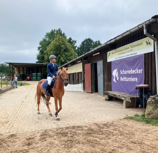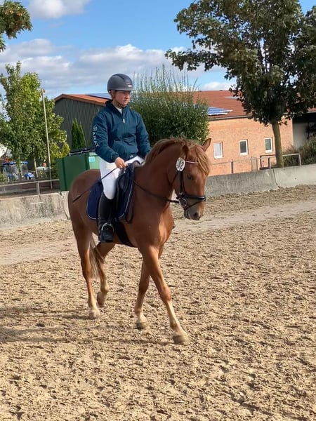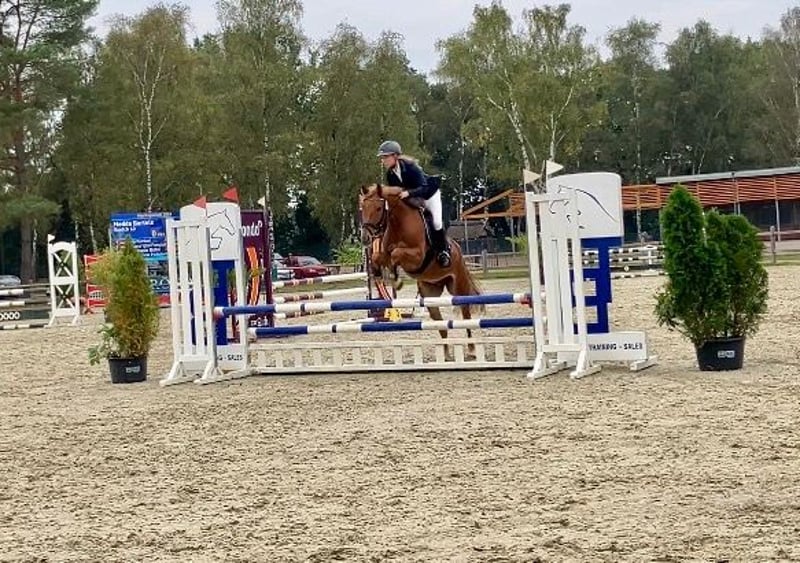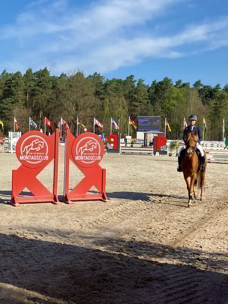 Scotch est né en 2020 dans notre écurie et a grandi dans un groupe de congénères du même âge. C'est un poney intelligent qui se laisse très bien monter dans les trois allures de base. Au saut, il montre un excellent antérieur. Actuellement, il participe à des compétitions de saut d'obstacles de niveau A* et A**. Il est monté uniquement en filet. Sa mère Cherie (135 cm) a remporté plusieurs épreuves de saut d'obstacles de niveau A contre des chevaux de grande taille – monté par des enfants – et a également fait ses preuves par son attitude et sa fiabilité au saut. Son père Szenario a été couronné de succès en parcours jusqu'à la classe S. Sa demi-sœur de six ans, Cotton Candy, réussit également dans le sport équestre. Rimondo : Scotch 60 Instagram : sportpferdezuchtdr.bartels